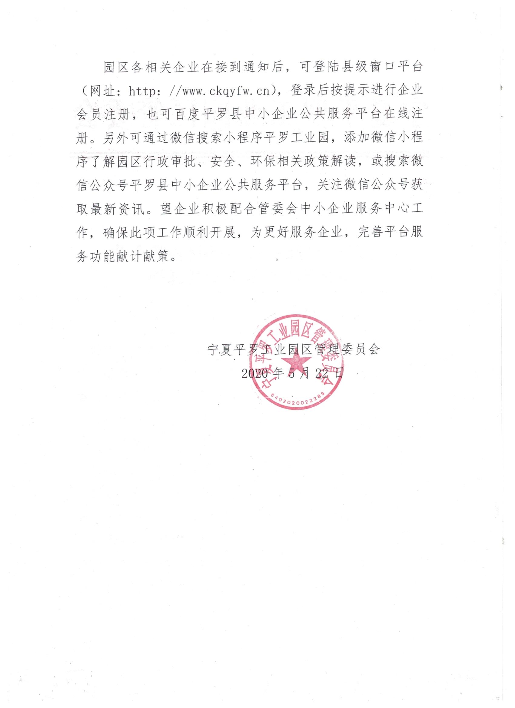 园区各相关企业在接到通知后,可登陆县级窗口平台(网址: http: //www. ckqyfw. cn),登录后按提示进行企业会员注册,也可百度平罗县中小企业公共服务平台在线注册。另外可通过微信搜索小程序平罗工业园,添加微信小程序了解园区行政审批、安全、环保相关政策解读,或搜索微信公众号平罗县中小企业公共服务平台,关注微信公众号获取最新资讯。望企业积极配合管委会中小企业服务中心工作,确保此项工作顺利开展,为更好服务企业,完善平台服务功能献计献策。