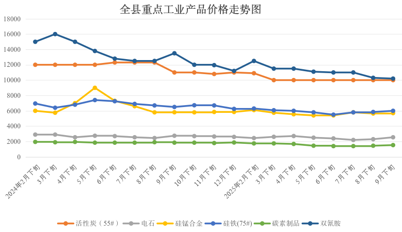 重点监测的11种工业品价格环比:6升3平2降,上涨的有:碳化硅(二级)、碳素、电石、高硅硅铁、碳化硅(一级)、硅铁(75#),分别上涨8.61%、5.52%、4.08%、2.38%、2.11%、1.69%;活性炭(60#)、活性炭(55#)、水泥与上期持平;下降的有硅锰、双氰胺,分别下降:1.72%、0.97%。同比:全部下降,其中降幅较大的有:双氰胺、碳化硅(一级)、碳素、高硅硅铁、碳化硅(二级)、水泥,分别下降:24.44%、18.03%、17.3%、15.69%、14.56%、11.54%。