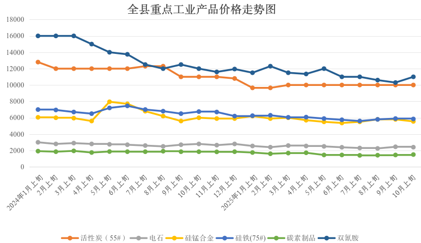 重点监测的11种工业品价格环比:3升3平5降,上涨的有:双氰胺、碳化硅(二级)、碳化硅(一级),分别上涨7.84%、1.85%、0.17%;活性炭(60#)、活性炭(55#)、高硅硅铁与上期持平;下降的有:水泥、电石、硅锰、硅铁(75#)、碳素,分别下降8.7%、5.88%、2.63%、2.5%、1.96%。同比:全部下降,其中降幅较大的有:碳素、碳化硅(一级)、高硅硅铁、电石、硅铁(75#),分别下降:18.92%、17.9%、15.69%、14.29%、13.33%。