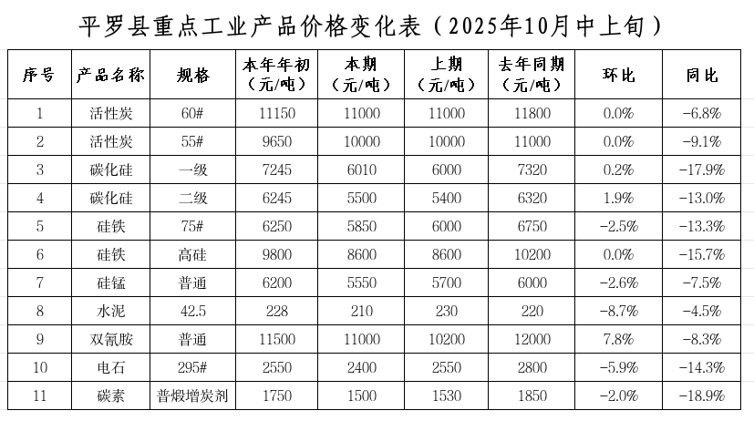 10月中上旬,工业经济运行总体保持平稳,重点监测的工业品环比电石价格小幅下降、硅锰价格小幅下降;全网日均用电负荷、全网用电量环比、同比均下降。