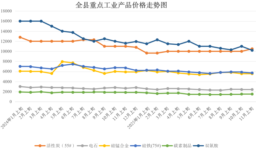 重点监测的11种工业品价格环比:3升4平4降,上涨的有:水泥、活性炭(55#)、活性炭(60#),分别上涨22.64%、5%、4.55%;硅铁(75#)、高硅硅铁、硅锰、碳素与上期持平;下降的有:电石、碳化硅(二级)、碳化硅(一级)、双氰胺,分别下降4%、1.85%、1.67%、1.45%。同比:全部下降,其中降幅较大的有:碳化硅(一级)、碳素、高硅硅铁、碳化硅(二级)、硅铁(75#)、双氰胺,分别下降:18.56%、18.03%、15.69%、15.13%、14.93%、12.07%。