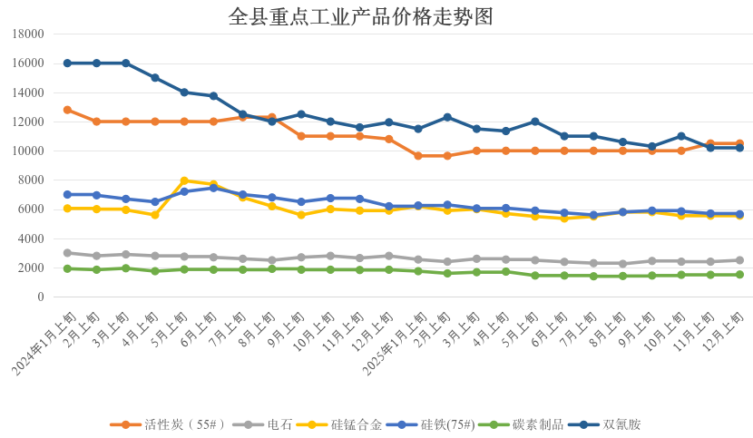 重点监测的11种工业品价格环比:1升9平1降,硅锰上涨1.83,硅铁(75#)下降0.88%,其余全部与上期持平。同比:除水泥上涨11.59%,活性炭(60#)与去年同期持平,其余全部下降,其中降幅较大的有:碳素、碳化硅(一级)、高硅硅铁、双氰胺、碳化硅(二级),分别下降:17.84%、17.74%、15.69%、14.64%、14.01%。