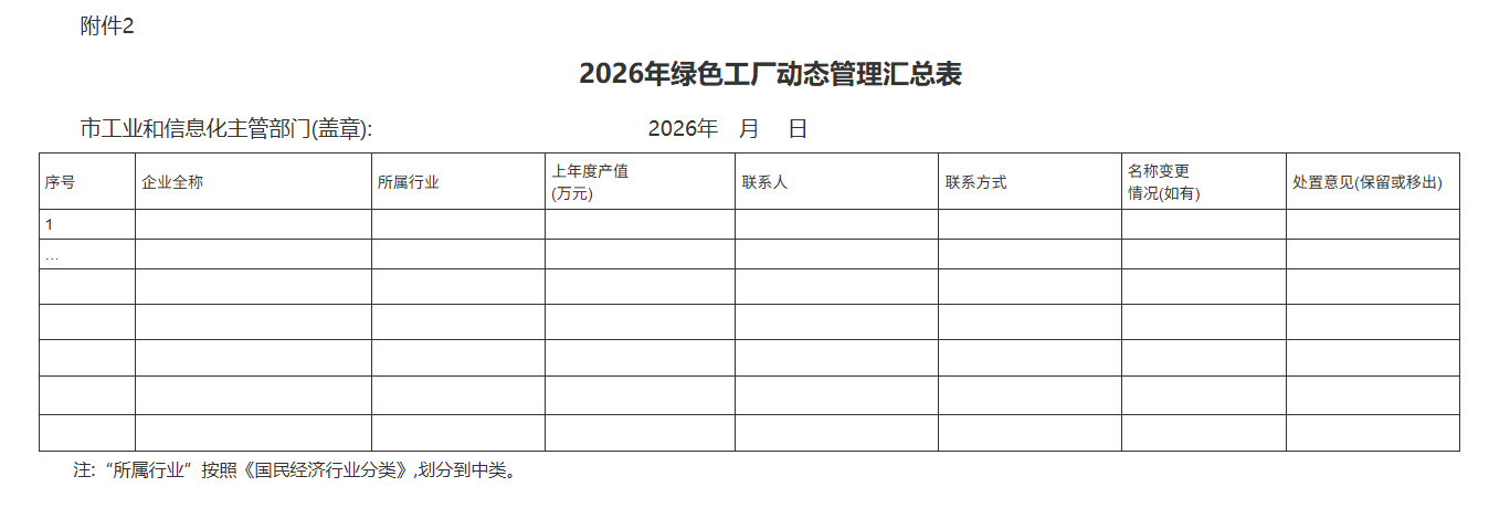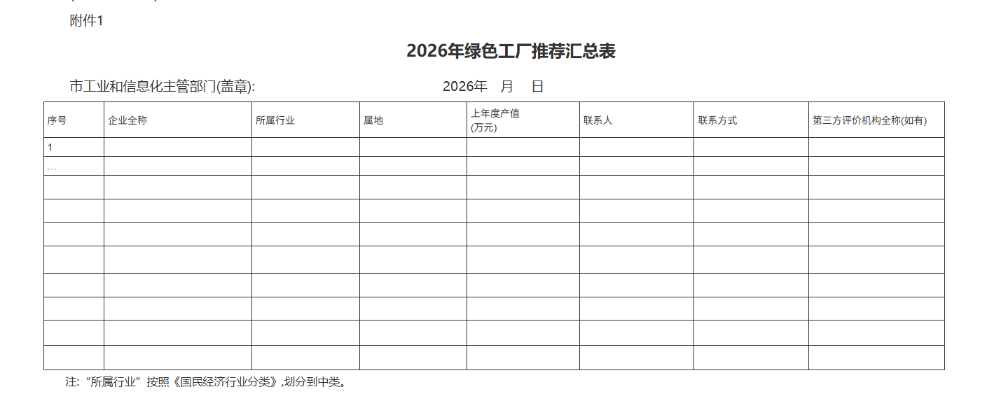 为深入贯彻落实国家和自治区关于推动绿色制造体系建设的决策部署,持续提升工业领域绿色发展水平,现就组织开展2026年自治区绿色工厂申报工作及对现有绿色工厂开展动态管理有关事项通知如下: