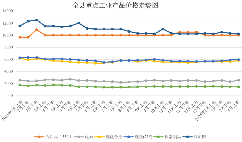 重点监测的11种工业品价格环比:4升4平3降,上涨的有:电石、硅锰、活性炭(60#)、硅铁(75#),分别上涨10.87%、3.57%、1.9%、0.85%;活性炭(55#)、碳化硅(一级)、水泥、碳素与上期持平;下降的有:碳化硅(二级)、高硅硅铁、双氰胺,分别下降19.61%、3.49%、0.97%;同比:1平10降,其中活性炭(55#)与同期持平,其余全部下降,其中降幅较大的有:碳化硅(二级)、碳化硅(一级)、水泥、碳素、双氰胺,分别下降:38.81%、18.31%、16.13%、13.69%、11.3%。