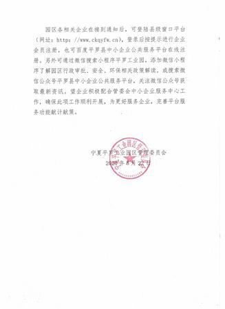 园区各相关企业在接到通知后,可登陆县级窗口平台(网址: http: //www. ckqyfw. cn),登录后按提示进行企业会员注册,也可百度平罗县中小企业公共服务平台在线注册。另外可通过微信搜索小程序平罗工业园,添加微信小程序了解园区行政审批、安全、环保相关政策解读,或搜索微信公众号平罗县中小企业公共服务平台,关注微信公众号获取最新资讯。望企业积极配合管委会中小企业服务中心工作,确保此项工作顺利开展,为更好服务企业,完善平台服务功能献计献策。
