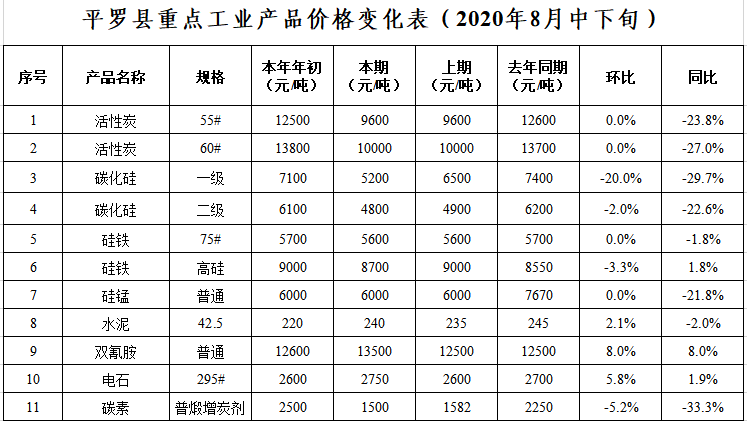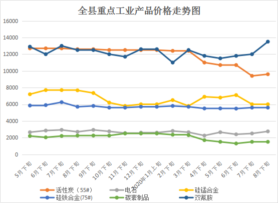(一)冶金行业。硅锰合金行情继续弱行,价格6000元/吨左右。市场需求略有好转,但价格没有明显起色,部分企业资金压力较重。目前,滨河物流园成品交搁库,缓解了部分冶金企业流动资金过于紧张的问题。短期来看,硅锰合金行情或继续弱稳运行。 (二)电石氰胺行业。下游PVC行情有所回暖,电石价格2750元/吨,较上旬上涨150元/吨。原材料兰炭价格低位,电石9月预计迎来不错的局面。氰胺企业市场供应面变化不大,下游需求量无明显改观。 (三)医药化工行业。秋季到来,农药行业市场进入淡季,下游企业减停产面扩大,原料价格略有上涨,产品价格、库存略有回落。化工产品下游企业低负荷运行,行情较7月略有回暖,但价格仍然较低。进出口方面,农资产品各国均开绿色通道,但从印度进口原料略受影响,化工产品出口越南畅通。医药和PVA企业出口份额大,订单大幅缩减。 (四)碳基材料行业。碳基材料市场整体仍然低迷,需求萎靡不振、价格持续下跌、报价乱象仍存在;市场供过于求,甚至有恶化趋势;外贸改善乏力;企业资金压力较大,部分企业已出现亏损局面。活性炭均价同比下降3000元/吨、炭素均价同比下降1000元/吨、碳化硅价格小幅上涨。目前后市不明朗,企业以保生存为主,部分已开始减产降负荷,规避高库存风险。重点监测的11种工业品价格环比3升4平4降,其中双氰胺上涨8.0%,电石上涨5.8%,水泥上涨2.1%;碳化硅(二级)下降2.0%,硅铁(高硅)下降3.3%,碳素下降5.2%,碳化硅(一级)下降20.0%;活性炭、硅锰、硅铁(75#)价格保持平稳。同比3升8降,其中双氰胺上涨8.0%,电石、硅铁(高硅)上涨1.8%-1.9%;硅铁(75#)下降1.8%,水泥下降2.0%,硅锰、碳化硅、活性炭、碳素下降21.8%-33.3%。