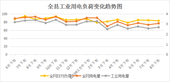 全网日均用电负荷83.22万千瓦,较8月中上旬上涨1.62万千瓦,环比上涨1.99%,同比下降3.89%;全网用电量3.07亿千瓦时,环比上涨5.86%,同比下降17.47%;工业用电量(不含自备电量)2.68亿千瓦时,环比上涨5.51%,同比下降20.94%。