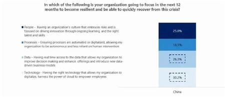 当被问及未来十二个月的首要任务时,受访的中国企业表示,将把重点放在技术(30%)、数据(26%)和人才(25%)上,并认为是企业韧性和经济复苏的最重要因素。