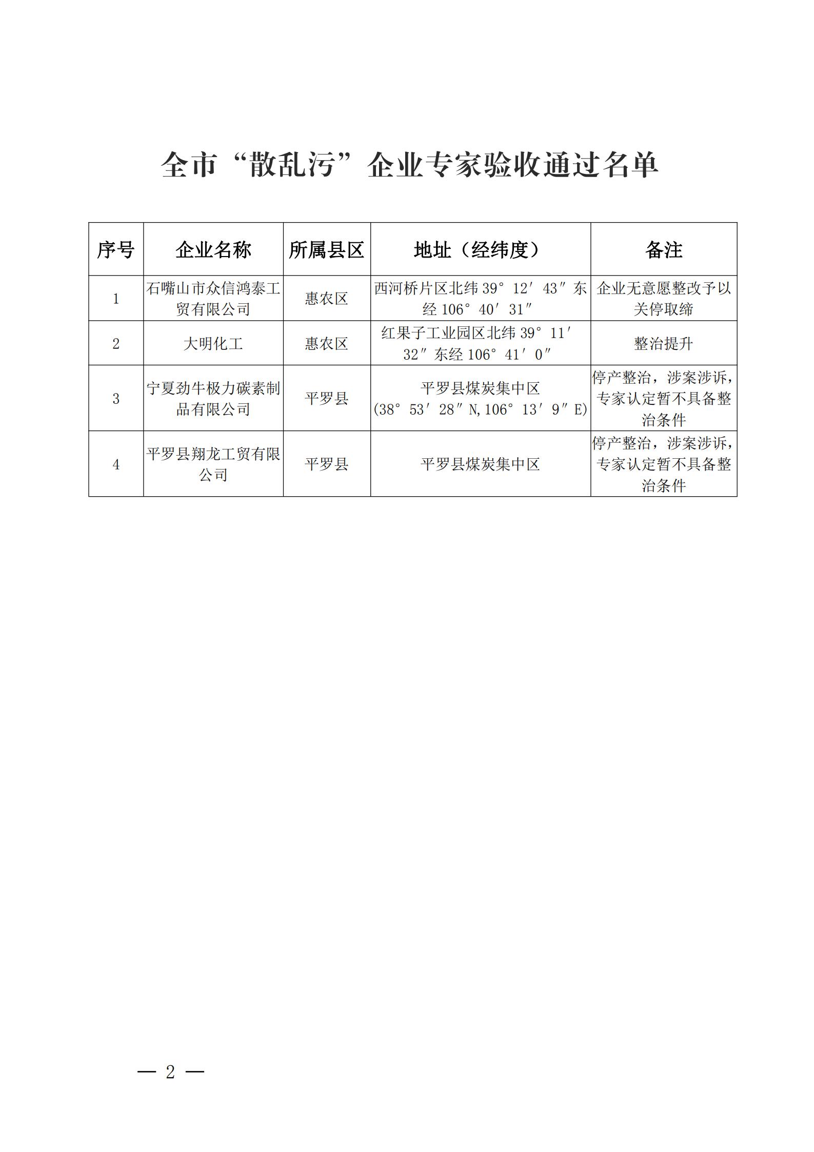 按照《石嘴山市“散乱污”企业动态清零和落实长效监管机制工作方案》要求,2020年11月17日,市贺兰山自然保护区清理整治指挥部组织相关专家对崇岗煤炭集中区通过验收的“散乱污”企业进行了市级验收。11月24日,市工信局组织环保、安全等领域的专家对各县区外围通过验收的“散乱污”企业进行市级验收。经两个专家组现场核查和查验档案资料,4家企业通过专家验收(惠农2家、平罗2家),现予以公示。