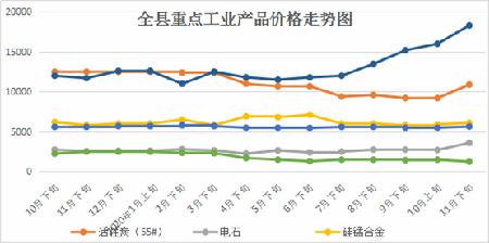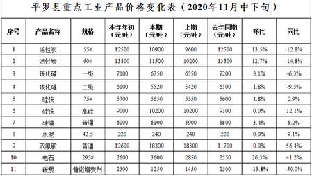 重点监测的11种工业品价格环比7升3平1降,其中电石上涨26.3%,活性炭上涨12.7%-13.5%,硅锰上涨3.4%,碳化硅上涨1.8%-3.1%,硅铁(75#)上涨1.8%;碳素下降13.8%;双氰胺、硅铁(高硅)、水泥价格保持平稳。同比6升5降,其中双氰胺上涨56.4%,电石上涨41.2%,硅铁(高硅)上涨12.1%,水泥上涨9.1%,硅锰上涨5.2%,硅铁(75#)上涨0.9%;碳化硅下降6.3%-9.5%,活性炭下降12.8%-14.8%,碳素下降50.0%。
