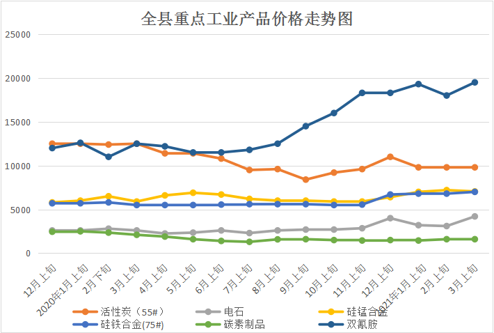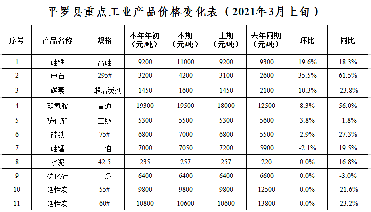 2021年第3期 本旬综述 3月中上旬,全县工业经济呈现稳中有进运行态势,重点工业品价格总体平稳,其中电石、双氰胺持续上涨;全网用电量、用电负荷同比上涨。 工业运行篇 工业经济指标 行业看点 (一)电石行业。受内蒙能耗双控限电停炉影响,电石市场供应持续偏紧,价格持续上涨,由上月的3100元/吨上升至4200元/吨,环比上涨35.5%,涨幅较为明显。从电石上下游产业链来看,上游原材料兰炭价格略有震荡,下游PVC行情小幅上涨,下游客户对电石采购积极,推动电石行情继续保持上行。 (二)硅锰行业。近期,受下游钢厂硅锰合金招标定价走低、检修影响,硅锰行情弱势运行,价格有所松动,硅锰价格7050元/吨左右,滑落至前期水平,相比上月下调150元/吨。硅锰市场观望情绪浓厚,成交比较僵持。上游锰矿价格稳挺运行略有上涨。预计短期内硅锰行情继续弱稳运行。 (三)活性炭行业。2月份以来,国内活性炭价格没有太大波动,市场需求不旺,目前企业多为订单销售,库存压力较小。活性炭价格基本与上月持平,均价为9800元/吨,短期内活性炭价格会保持稳定。 (四)洗煤行业。近期,洗煤行业市场供应充足,精洗煤价格1100元/吨,与2月持平。由于钢厂库存较多,市场供大于求,市场销售略有下降。目前,企业倾向于按单生产,待钢厂库存进一步释放后,预计精洗煤价格会有回升。 重点产品价格 重点监测的11种工业品价格环比6升4平1降,其中电石上涨35.5%,硅铁(高硅)上涨19.6%,碳素上涨10.3%,双氰胺上涨8.3%,碳化硅(二级)上涨3.8%,硅铁(75#)上涨2.9%;硅锰下降2.1%;水泥、碳化硅(一级)、活性炭价格保持平稳。同比6升5降,其中,电石上涨61.5%,双氰胺上涨56.0%,硅铁(75#)上涨27.3%,硅锰上涨19.5%,硅铁(高硅)上涨18.3%,水泥上涨16.8%;碳化硅下降1.8%-3.0%,活性炭下降21.6%-23.2%,碳素下降23.8%。 工业经济增长点 工业税收 用电量 全网日均用电负荷111.01万千瓦,较2月中下旬下降1.57万千瓦,环比下降1.39%,同比上涨36.71%;全网用电量4.20亿千瓦时,环比上涨0.24%,同比上涨51.08%。 项目建设篇 项目建设情况 2021年,计划实施工业项目83个,计划总投资182.29亿元,当年计划完成投资48.44亿元。其中:新建项目26个,计划总投资77.7亿元,当年完成投资19.7亿元;续建项目23个,计划总投资60.9亿元,当年完成投资12.3亿元;技改项目34个,计划总投资43.7亿元,当年完成投资16.5亿元。 一季度,计划开工工业项目52个,计划总投资96.9亿元,当年完成投资28.23亿元,其中:新建项目10个,计划总投资11.45亿元,当年完成投资5.55亿元;续建项目21个,计划总投资55亿元,当年完成投资11.5亿元;技改项目21个,计划总投资30.4亿元,当年完成投资11.2亿元。 工作动态