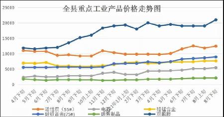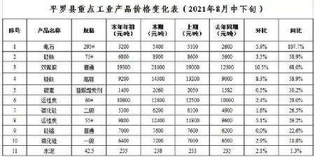 8月中下旬,工业经济运行总体平稳,大宗工业品价格稳中有升;全网用电量、用电负荷同比环比均上涨。 (一)电石行业。近期,受内蒙、宁夏政策面影响,电石市场供应持续偏紧,电石价格从上月的4600元/吨上涨至5100元/吨,涨幅明显。本月上游兰炭价格较上月增加240元/吨,对电石价格形成有力支撑。下游PVC行情高位盘整,电石需求增加,预计电石价格将继续保持在高位运行。 (二)硅锰行业。近期,受内蒙、宁夏等主产地限电、限产影响,企业现货供应紧张,硅锰行情持续平稳运行。本月硅锰产品价格7600元/吨,较上月增加300元/吨。另外,随着电价上调、运费上涨、上游原材料焦炭等成本价格走高,硅锰行情基本呈现易涨难跌态势。 (三)活性炭行业。受成本不断攀高影响,活性炭产品价格随之走高,55#活性炭价格最高达到12500元/吨。但由于市场需求不旺,一直处于有价无市状态。本月活性炭均价11800元/吨,较上月有所松动,下降700元/吨。随着价格下调,市场成交量有望改善,将利于企业释放库存。 (四)洗煤行业。今年以来,国内煤炭市场供应持续紧张,原煤一路上涨,洗煤行业成本不断增加,精洗煤价格随之上升,本月达到1600元/吨左右,较上月上涨150元/吨。短期来看,受供需错配影响,煤炭市场依旧紧张,精洗煤价格仍有进一步走高可能。重点产品价格