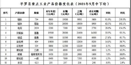 重点监测的11种工业品价格,环比:11升,其中硅铁上涨62.5-91.9%,双氰胺上涨33.3%,电石上涨29.6%,硅锰上涨27.8%,活性炭上涨2.5-14.1%,碳素上涨7.8%,水泥上涨3.8%,碳化硅上涨1.3-1.5%。同比:11升,其中硅铁上涨192.1-239.3%,电石上涨154.5%,双氰胺上涨93.1%,硅锰上涨91.7%,活性炭上涨48.8-58.7%,碳化硅上涨24.6-43.5%,碳素上涨38.8%,水泥上涨2.9%。