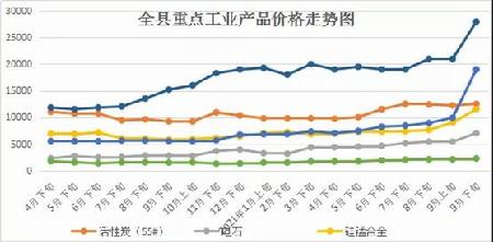 9月中下旬,工业经济运行总体平稳,大宗工业品价格稳中有升;全网用电量、用电负荷同比上涨、环比下降。(一)电石行业。随着能耗双控力度的不断加大,电石产量下降,电石市场供不应求,电石价格大幅上涨,本月为7000元/吨,环比上涨了1600元/吨。从上下游来看,兰炭价格较上月上涨了1550元/吨,对电石价格支撑有力。下游PVC行情高位盘整,客户采购积极,预计电石行情短期内将持续走高。(二)硅锰行业。近日,受内蒙、宁夏等主产地限产、停产影响,硅锰现货供应紧张,硅锰价格暴涨,目前硅锰价格在11500元/吨左右,较上月上涨2500元/吨。随着峰谷分时电价出台及原料锰矿成本上涨,企业成本不断攀升,对硅锰价格形成有力支撑,预计短期内硅锰行情将持续强势运行。(三)活性炭行业。由于原料成本不断攀升,活性炭产品价格随之上涨,本月活性炭均价为13500元/吨,较上月上涨750元/吨,涨幅较为明显。但活性炭市场需求不旺,依旧处于有价无市状态,实际成交量并不高,企业实际利润有限。(四)洗煤行业。今年以来,煤炭市场供应持续偏紧,洗煤企业原料成本不断攀升,精洗煤价格随之上涨,本月精洗煤达到2050元/吨左右,环比上涨250元/吨,与年初相比价格翻倍。随着冬季采暖期的到来,煤炭供应将持续紧张,若不扩大煤炭供应,预计精洗煤价格将继续上涨。重点产品价格
