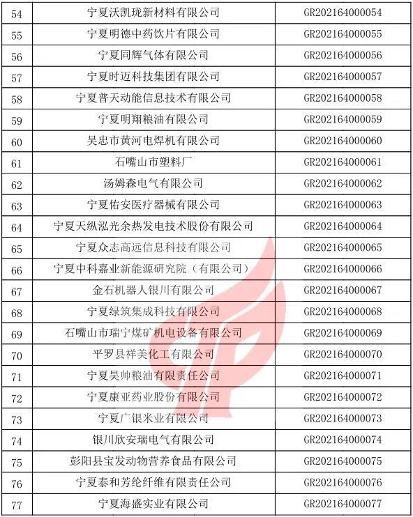 根据《高新技术企业认定管理办法》(国科发火〔2016〕32号)和《高新技术企业认定管理工作指引》(国科发火〔2016〕195号)有关规定,现将宁夏回族自治区2021年第一批备案的77家高新技术企业名单(详见附件)予以公告。