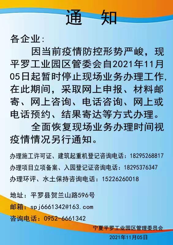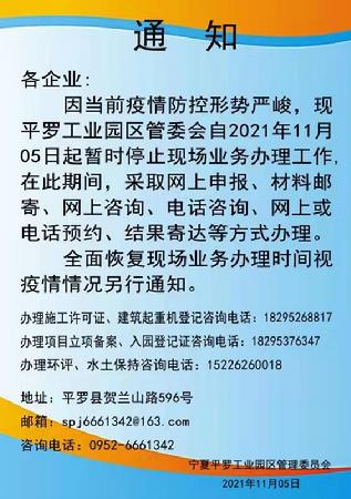 关于暂时停止宁夏平罗工业园区管理委员会现场业务办理的通知