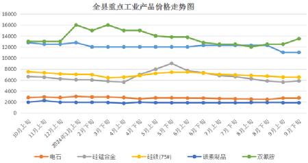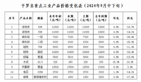 重点监测的11种工业品价格环比:4升7平,其中水泥、双氰胺、硅锰、电石上涨15%、8%、3.8%、1.9%;活性炭(60#)、活性炭(55#)、硅铁(75#)、高硅硅铁、碳化硅(二级)、碳化硅(一级)、碳素与上期持平。同比:2升9降,其中水泥上涨10.2%、双氰胺上涨3.8%;降幅较大的有:碳化硅(二级)、碳化硅(一级)、碳素、活性炭(60#)、高硅硅铁分别下降:22.9%、20.4%、17.8%、16.7%、16.4%。