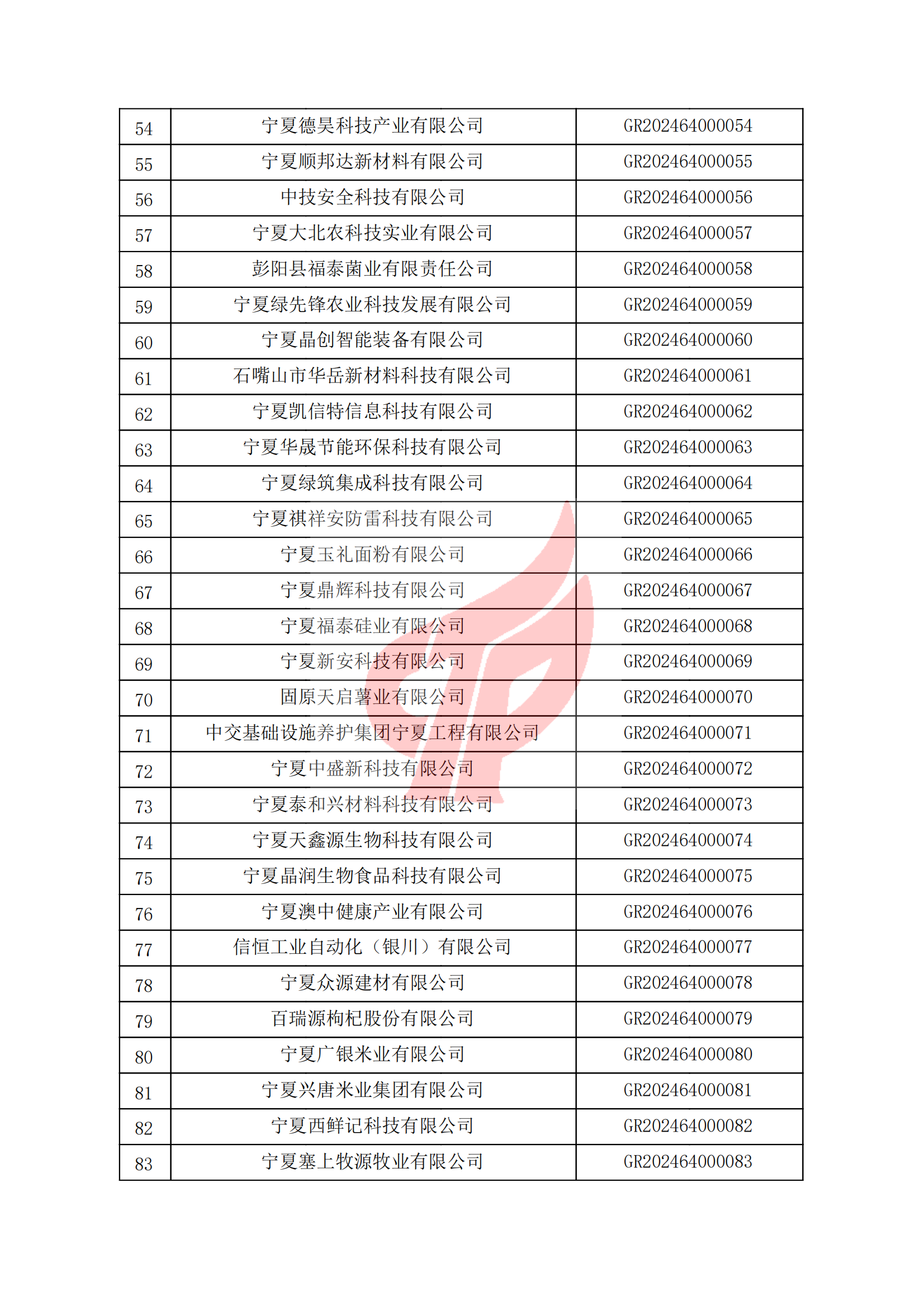 根据《高新技术企业认定管理办法》(国科发火〔2016〕32号)和《高新技术企业认定管理工作指引》(国科发火〔2016〕195号)有关规定,现对宁夏回族自治区认定机构2024年认定报备的第一批142家高新技术企业备案名单(详见附件)予以公告。 附件:宁夏回族自治区认定机构2024年认定报备的第一批高新技术企业备案名单 全国高新技术企业认定管理工作领导小组办公室 2024年12月4日 附件: