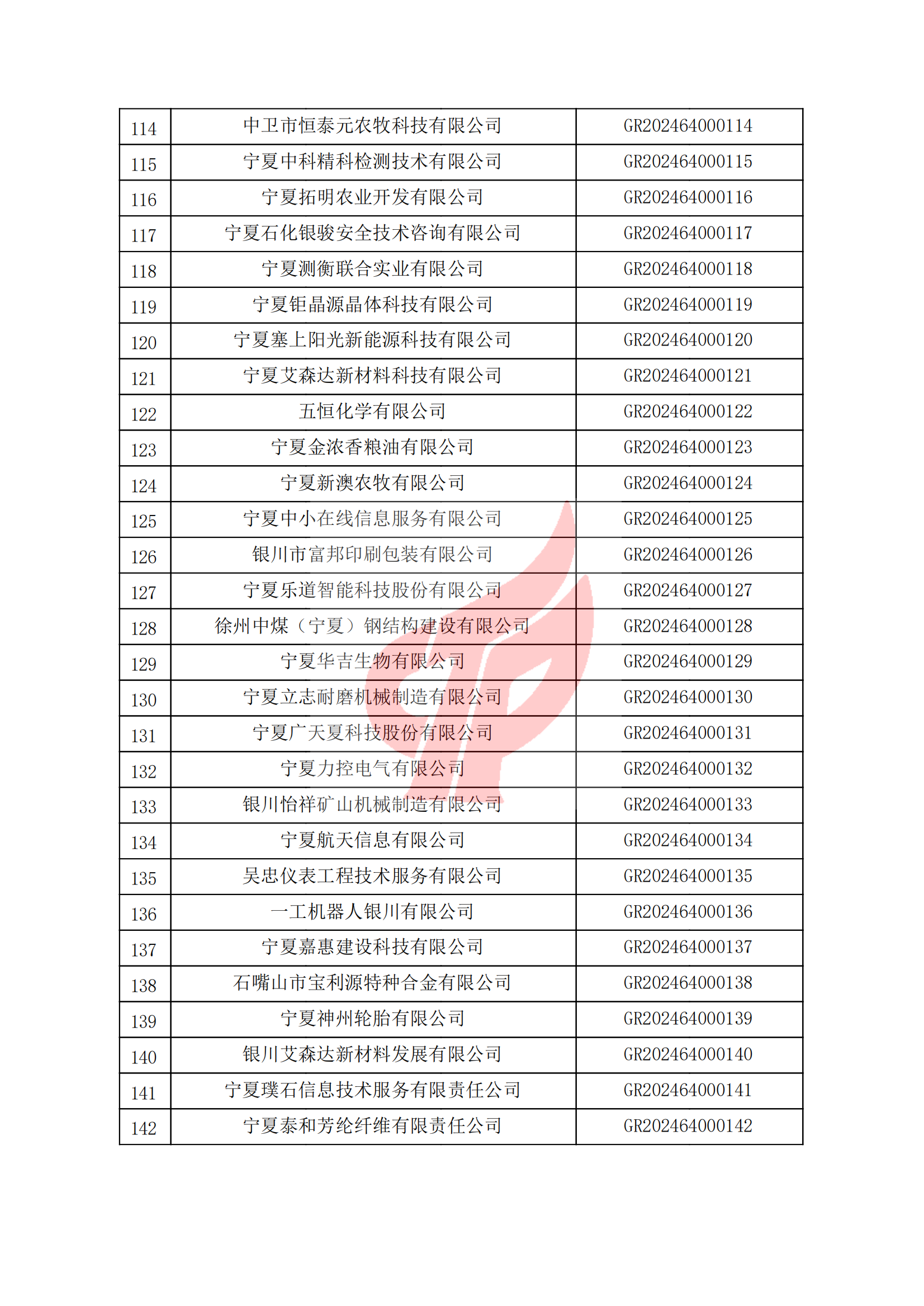 根据《高新技术企业认定管理办法》(国科发火〔2016〕32号)和《高新技术企业认定管理工作指引》(国科发火〔2016〕195号)有关规定,现对宁夏回族自治区认定机构2024年认定报备的第一批142家高新技术企业备案名单(详见附件)予以公告。