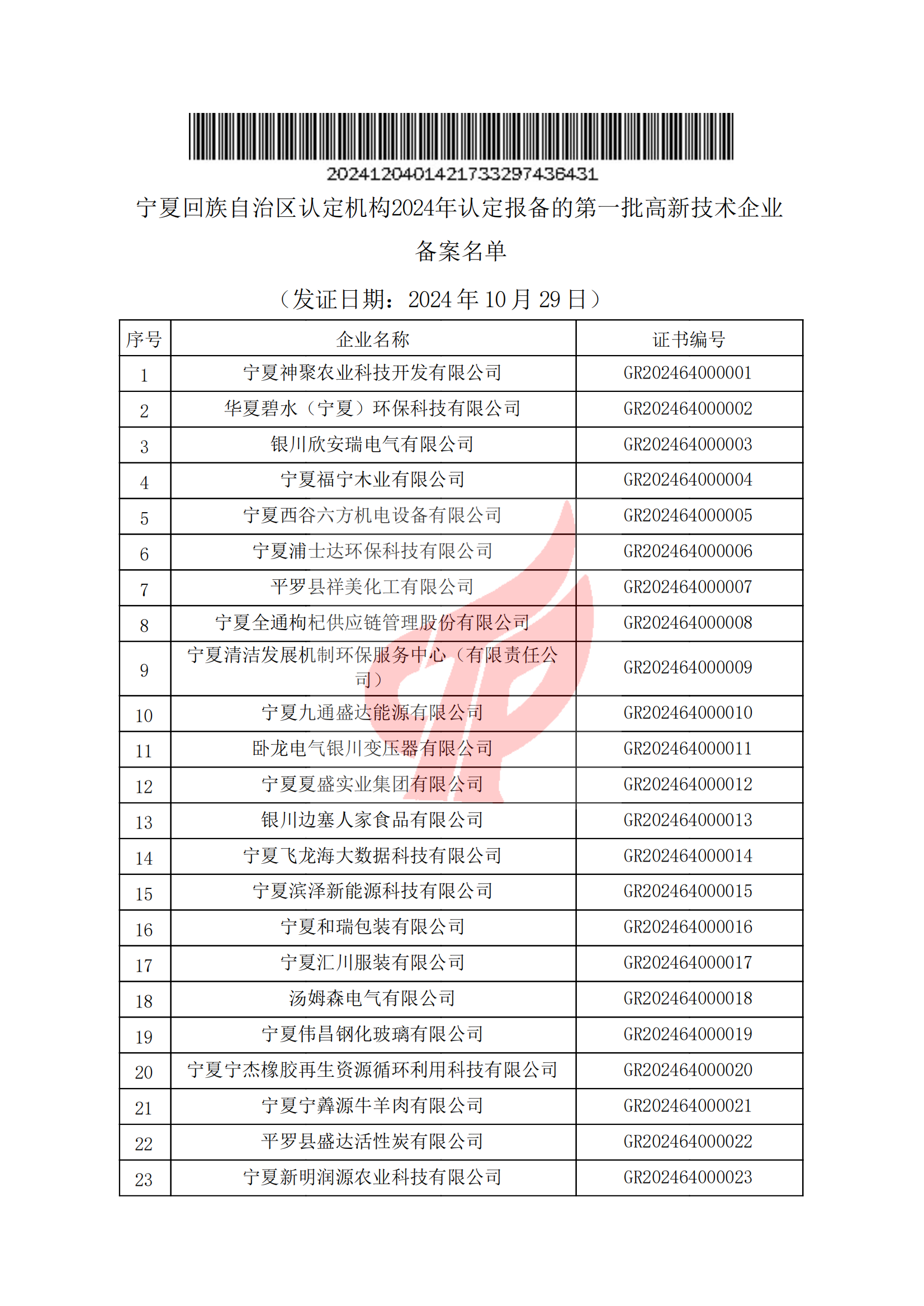 附件:宁夏回族自治区认定机构2024年认定报备的第一批高新技术企业备案名单