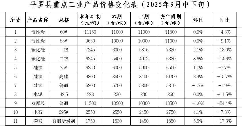 重点监测的11种工业品价格环比:6升3平2降,上涨的有:碳化硅(二级)、碳素、电石、高硅硅铁、碳化硅(一级)、硅铁(75#),分别上涨8.61%、5.52%、4.08%、2.38%、2.11%、1.69%;活性炭(60#)、活性炭(55#)、水泥与上期持平;下降的有硅锰、双氰胺,分别下降:1.72%、0.97%。同比:全部下降,其中降幅较大的有:双氰胺、碳化硅(一级)、碳素、高硅硅铁、碳化硅(二级)、水泥,分别下降:24.44%、18.03%、17.3%、15.69%、14.56%、11.54%。