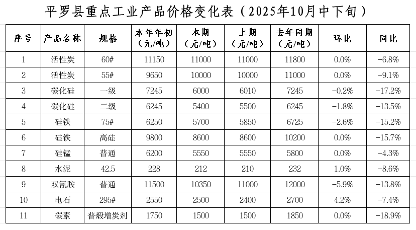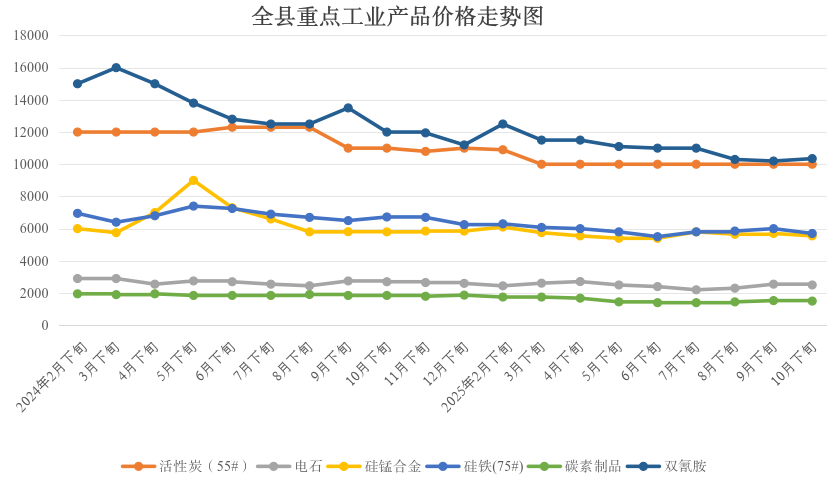 重点监测的11种工业品价格环比:2升5平4降,上涨的有:电石、水泥,分别上涨4.17%、0.95%;活性炭(60#)、活性炭(55#)、高硅硅铁、硅锰、碳素与上期持平;下降的有:双氰胺、硅铁(75#)、碳化硅(二级)、碳化硅(一级),分别下降5.91%、2.56%、1.82%、0.17%。同比:全部下降,其中降幅较大的有:碳素、碳化硅(一级)、高硅硅铁、硅铁(75#)、双氰胺、碳化硅(二级),分别下降:18.92%、17.18%、15.69%、15.24%、13.75%、13.53%。