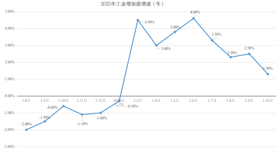 1-10月份,全县规上工业增加值累计同比增长1.3%。石嘴山市同比增长4.1%,大武口区同比增长3.4%,惠农区同比增长8.3%。