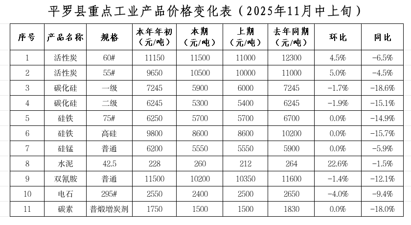重点监测的11种工业品价格环比:3升4平4降,上涨的有:水泥、活性炭(55#)、活性炭(60#),分别上涨22.64%、5%、4.55%;硅铁(75#)、高硅硅铁、硅锰、碳素与上期持平;下降的有:电石、碳化硅(二级)、碳化硅(一级)、双氰胺,分别下降4%、1.85%、1.67%、1.45%。同比:全部下降,其中降幅较大的有:碳化硅(一级)、碳素、高硅硅铁、碳化硅(二级)、硅铁(75#)、双氰胺,分别下降:18.56%、18.03%、15.69%、15.13%、14.93%、12.07%。