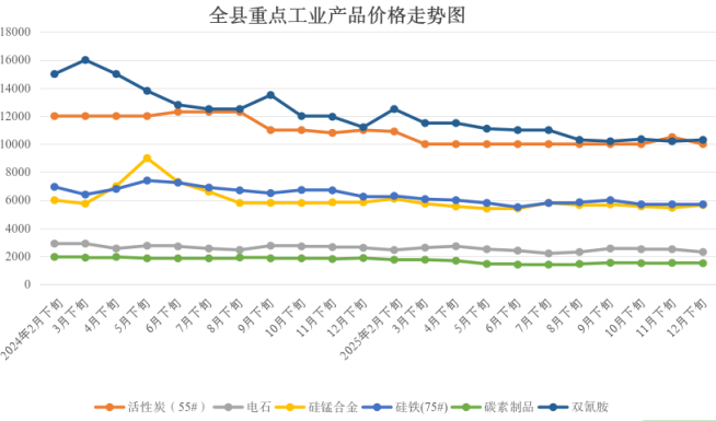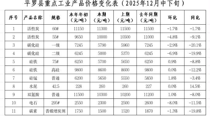 重点监测的11种工业品价格环比:3升2平6降,上涨的有:硅锰、双氰胺、硅铁(75#),分别上涨1.8%、0.98%、0.88%;高硅硅铁、水泥与上期持平;下降的有:电石、碳化硅(二级)、活性炭(55#)、碳化硅(一级)、活性炭(60#)、碳素,分别下降8%、6.89%、4.76%、2.85%、1.74%、1.32%;同比:1升10降,其中水泥上涨14.54%,其余全部下降,其中降幅较大的有:碳化硅(一级)、碳素、碳化硅(二级)、高硅硅铁、电石,分别下降:20.08%、19.79%、19.94%、12.24%、11.54%。