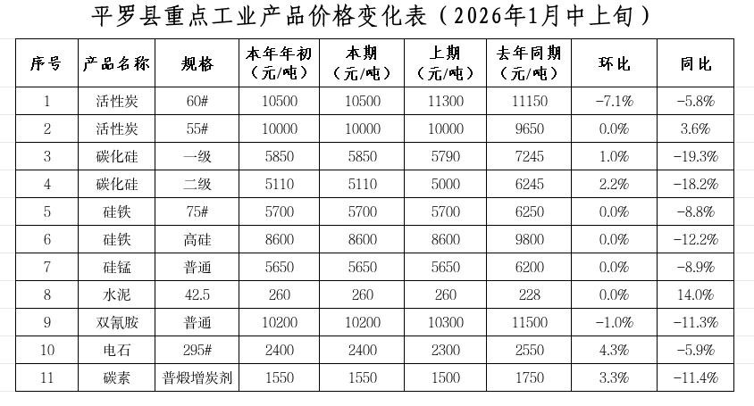 重点监测的11种工业品价格环比:4升5平2降,上涨的有:电石、碳素、碳化硅(二级)、碳化硅(一级),分别上涨4.35%、3.33%、2.2%、1.04%;活性炭(55#)、硅铁(75#)、高硅硅铁、硅锰、水泥与上期持平;下降的有:活性炭(60#)、双氰胺,分别下降7.08%、0.97%;同比:1升10降,其中活性炭(55#)上涨3.63%,其余全部下降,其中降幅较大的有:碳化硅(一级)、碳化硅(二级)、高硅硅铁、碳素、双氰胺,分别下降:19.25%、18.17%、12.24%、11.43%、11.3%。