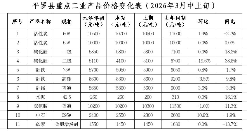 重点监测的11种工业品价格环比:4升4平3降,上涨的有:电石、硅锰、活性炭(60#)、硅铁(75#),分别上涨10.87%、3.57%、1.9%、0.85%;活性炭(55#)、碳化硅(一级)、水泥、碳素与上期持平;下降的有:碳化硅(二级)、高硅硅铁、双氰胺,分别下降19.61%、3.49%、0.97%;同比:1平10降,其中活性炭(55#)与同期持平,其余全部下降,其中降幅较大的有:碳化硅(二级)、碳化硅(一级)、水泥、碳素、双氰胺,分别下降:38.81%、18.31%、16.13%、13.69%、11.3%。